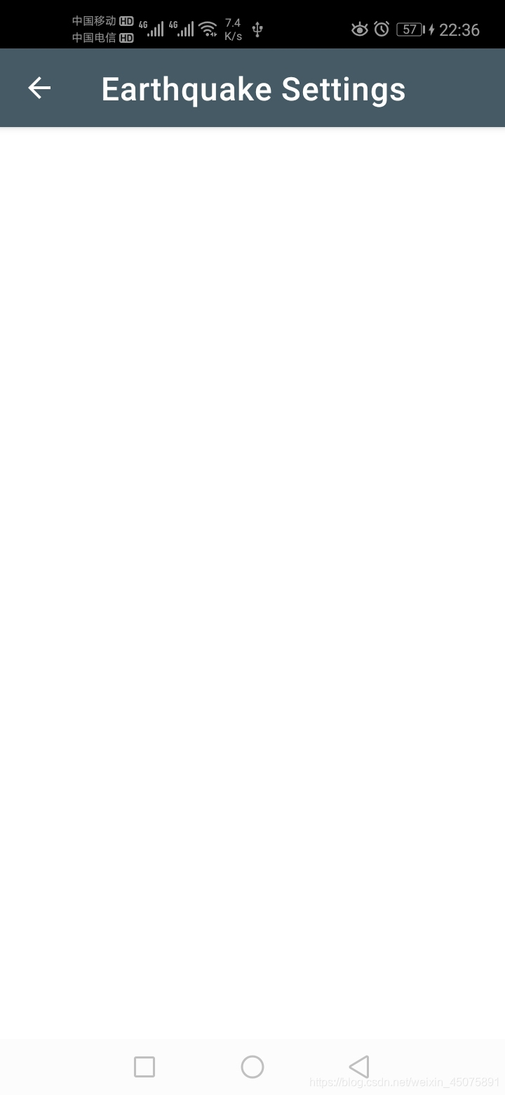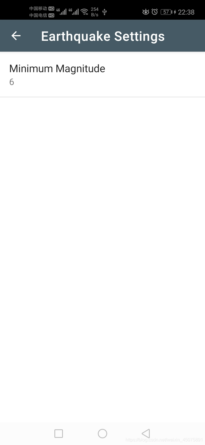 由于这是 EarthquakePreferenceFragment 遇到的第一个 first ListPreference, 请更新 EarthquakePreferenceFragment 中的 toonPreferenceChange() 方法,以 正确更新 ListPreference 的摘要(使用标记, 而非键)。