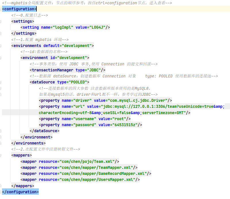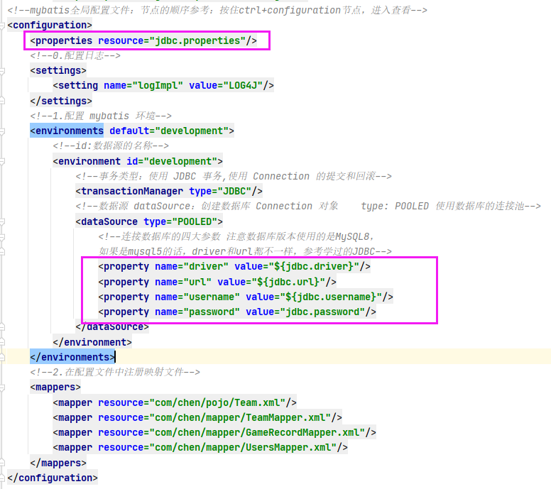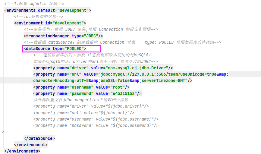 配置文件中配置mybatis的环境(数据源、事务类型)