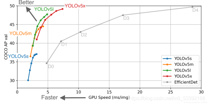 yolov5有4种配置,不同配置的特性如下,我这里选择yolov5s,速度最快,但是效果最拉胯