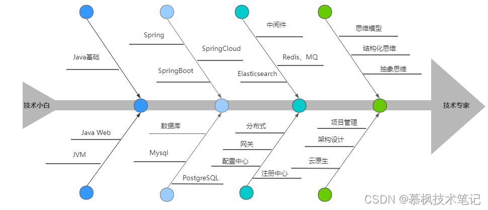 最近很多读者朋友问慕枫如何能够进行Java入门学习以及构建自己的技术体系,总感觉Java技术知识浩如烟海,网上资料又多如牛毛,根本不知道应该从哪里入手进行学习,另外觉得自己学习的内容零零碎碎不成体系,感觉十分的迷茫。为了解答大家的疑惑,慕枫特意梳理了Java小白到技术专家成长过程中必备的技术体系(这次可是拿出来压箱底的技术总结思维导图)。希望这份技术成长路线总结可以对大家在学习Java的过程中有所帮助,在学习上可以做到有的放矢。