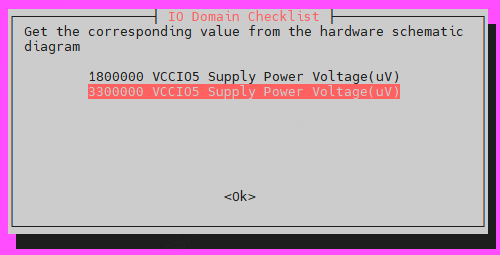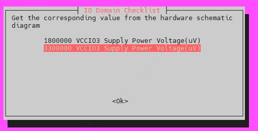 电源选择,选择不对会编译报错,这里大家记住除了VCCIO4和6选1.8V其他都选3V3,如果没有弹电源选择框则需要安装sudo apt install whiptail后在重新编译。