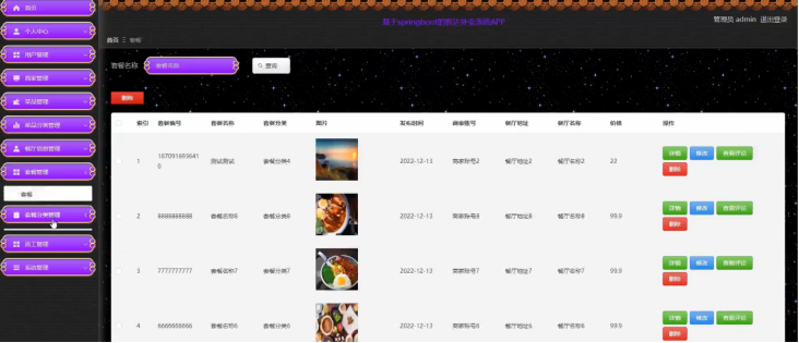 套餐管理;在套餐管理页面,管理员可以查看已有的套餐信息,并进行修改、删除、查看评论的操作;管理员还可以对套餐分类进行管理;具体操作页面如下图所示。