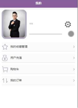 用户登录成功后,点击“我的”进入我的页面,在我的页面可以对个人信息、我的收藏管理、用户充值、购物车、我的订单等进行详细操作。我的界面如图5-5所示。