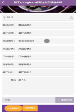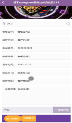 在菜品信息界面,用户可以查看菜品详细信息,并进行收藏、添加评论、加入购物车、立即购买的操作。菜品信息详情如图5-3所示。