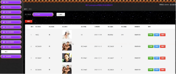员工管理;在员工管理页面,管理员可以查看已有的员工信息,并进行修改、删除、查询等操作;具体操作页面如下图所示。