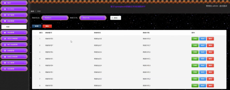 商家管理;在商家管理页面管理员可以商家信息进行查看详情、修改、删除或查询等操作,管理员还可以对商家信息进行新增的操作,如图5-10所示。