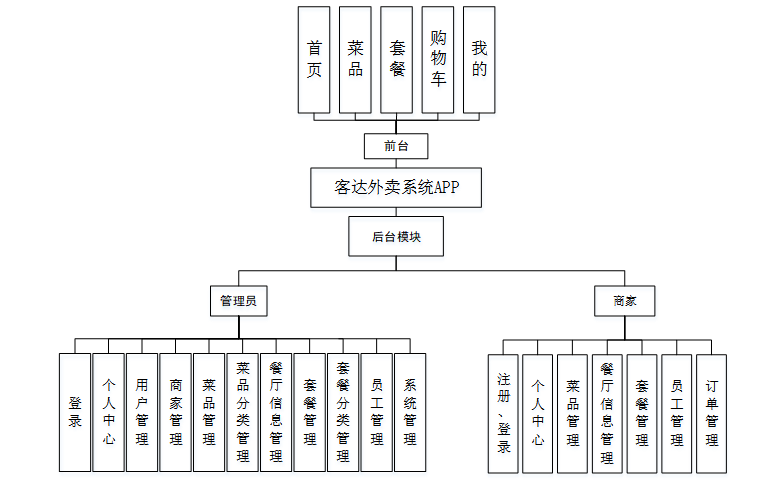 总体上看,客达外卖系统APP具有注册、登录、个人中心、用户管理、商家管理、菜品管理、菜品分类管理、餐厅信息管理、套餐管理、套餐分类管理、员工管理、系统管理等功能模块。以下为几个主要模块简单介绍: