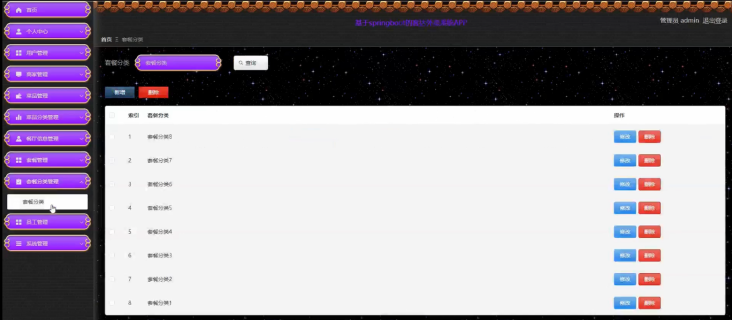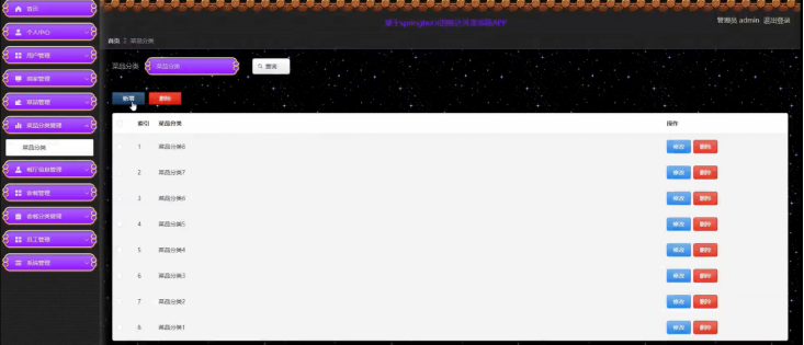 菜品管理;在菜品管理页面,可以对菜品信息进行修改、删除、查询、查看评论等操作;管理员还可以对菜品分类信息进行管理,具体操作页面如下图所示。