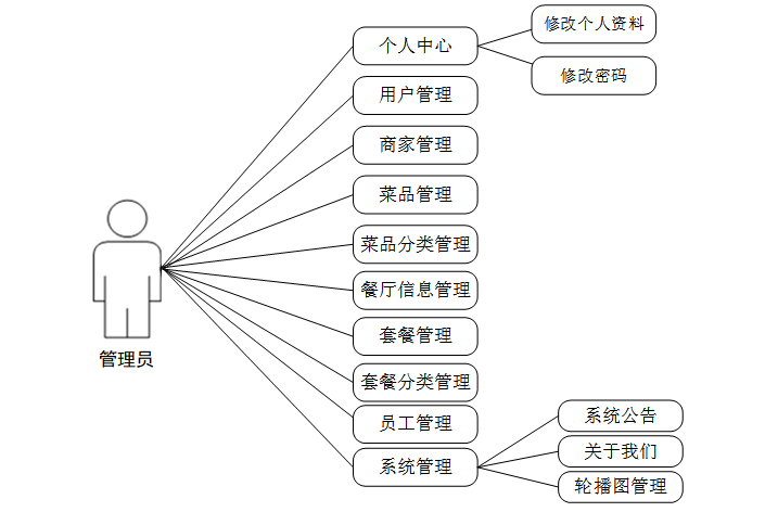 (5)管理员可以对个人中心、用户管理、商家管理、菜品管理、菜品分类管理、餐厅信息管理、套餐管理、套餐分类管理、员工管理、系统管理等功能进行管理。