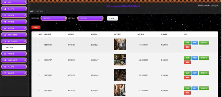 餐厅信息管理;在餐厅信息管理页面,管理员可以对餐厅信息进行查看详情、修改、查看评论、删除或查询等操作;具体操作页面如下图所示。