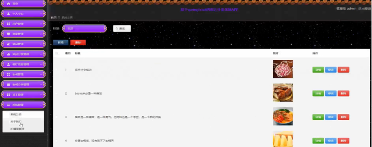 系统管理;在系统管理页面,管理员可以对系统公告、关于我们、轮播图管理等功能模块进行管理;具体操作页面如下图所示。