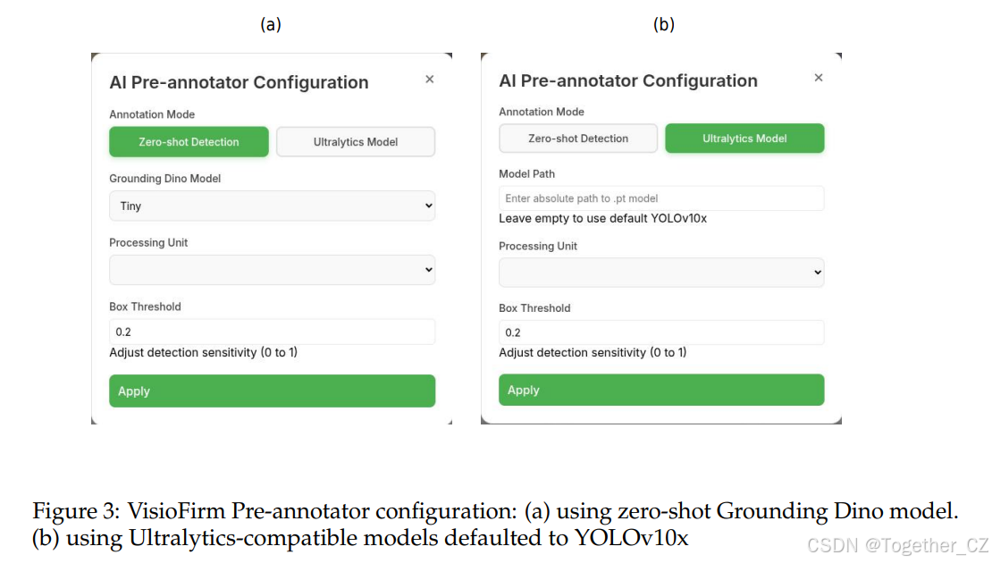VFPreAnnotator 是 VisioFirm 的核心自动化组件,旨在使用混合检测流程生成高召回率的初始标注。它使用 Python 实现,并使用诸如 Ultralytics、Transformers 和 CLIP 等库,以批处理模式处理图像,查询项目数据库以获取类别和路径。图 3 是 VisioFirm 应用程序中提供的预标注选项的可视化。
