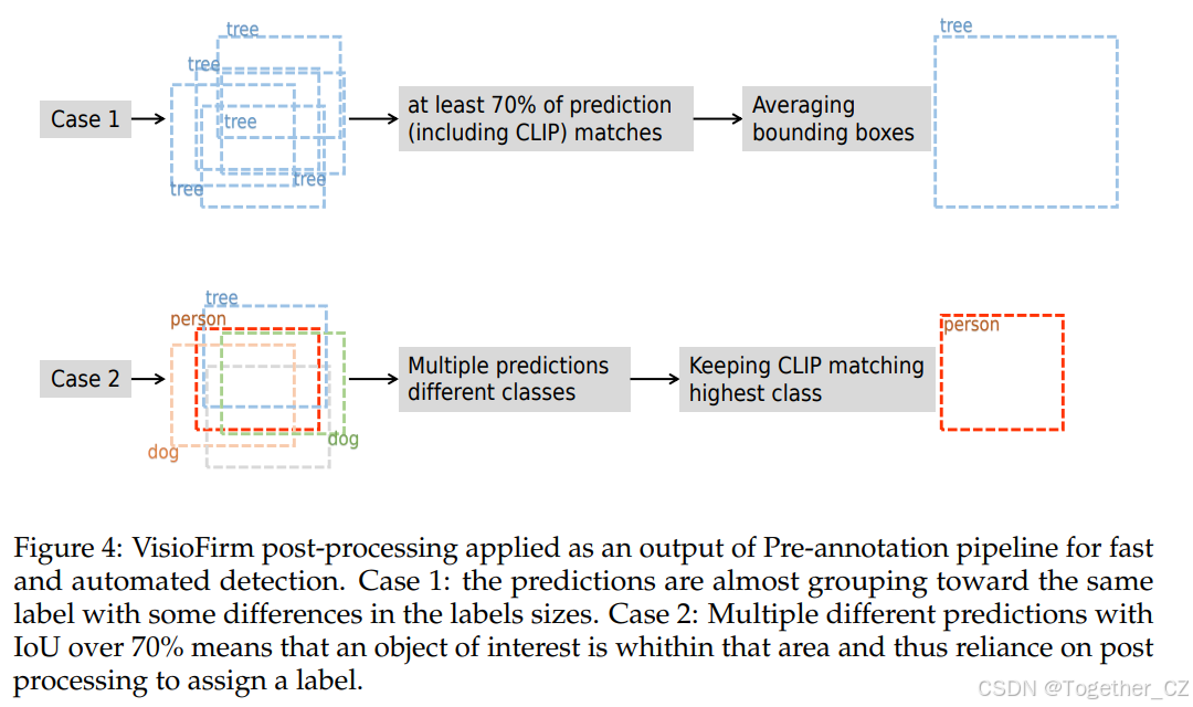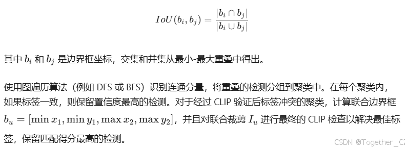VisioFirm 流程采用过滤和后处理技术来完善预标注,去除冗余并提高质量。通过 IoU-Graph 连通分量聚类解决列出的预标注之间的冗余:构建一个图 G,其中节点代表检测,边连接 IoU 大于 0.9 的配对,计算公式为: