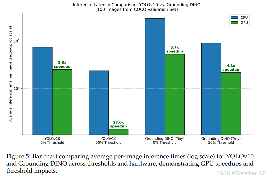 Grounding DINO(Tiny 变体)的推理延迟:在 0% 阈值下,CPU 平均每张图像 29.86 秒(总计 49 分 46 秒),而 GPU 平均每张图像 5.28 秒(总计 8 分 48 秒),速度提高了 5.7 倍。在 50% 阈值下,CPU 平均每张图像 9.03 秒(总计 15 分 3 秒),GPU 为每张图像 2.18 秒(总计 3 分 38 秒),速度提高了 4.1 倍。
