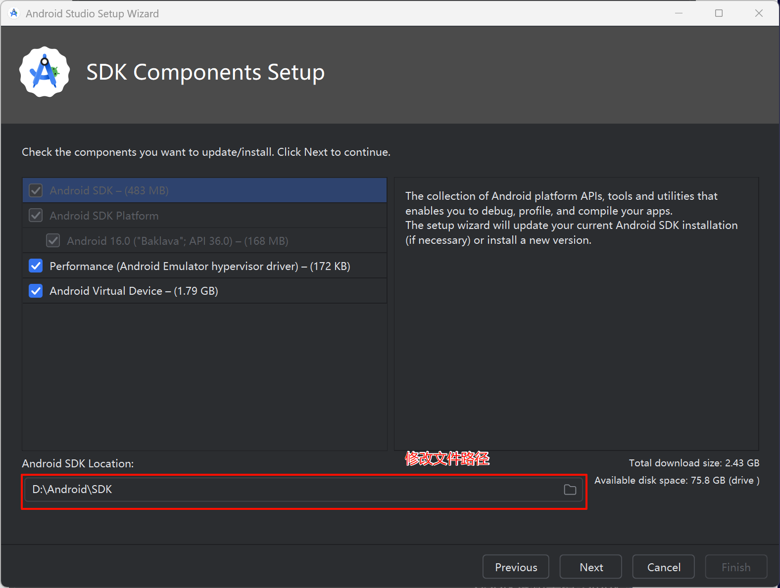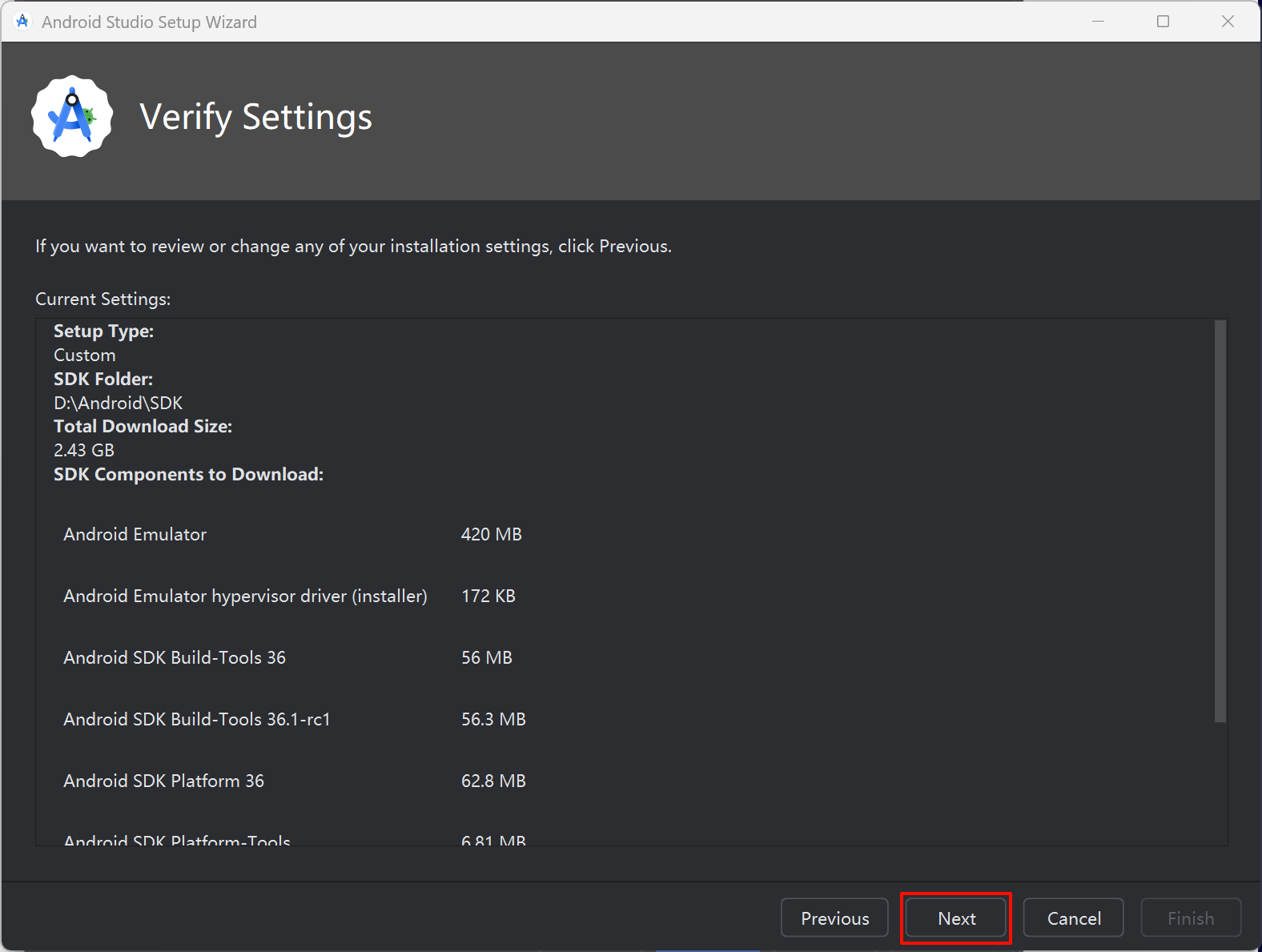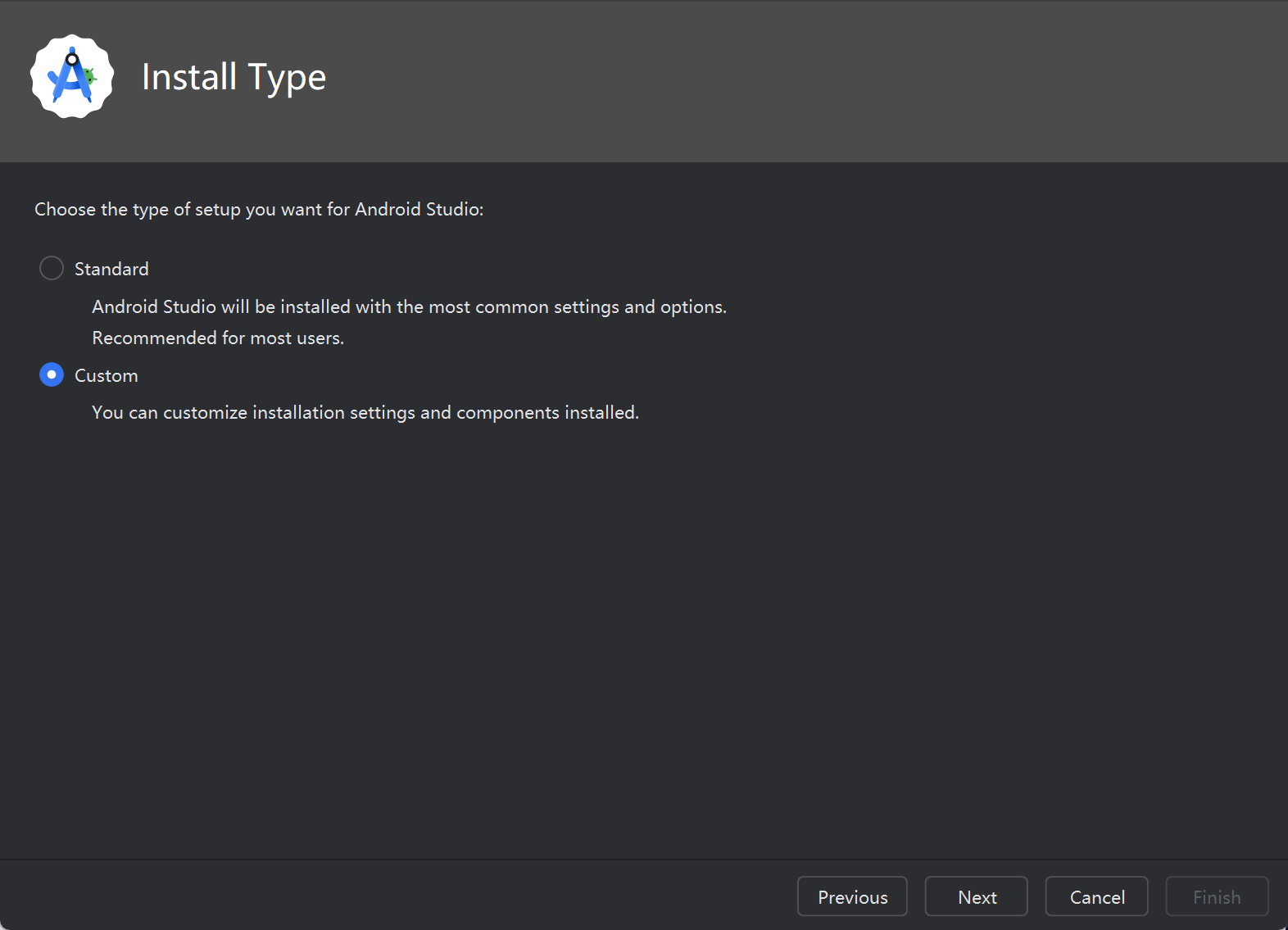 Android Studio 默认会把你的SDK下载放在C盘,这里你要选择Custom,然后点击 Next 下一步。