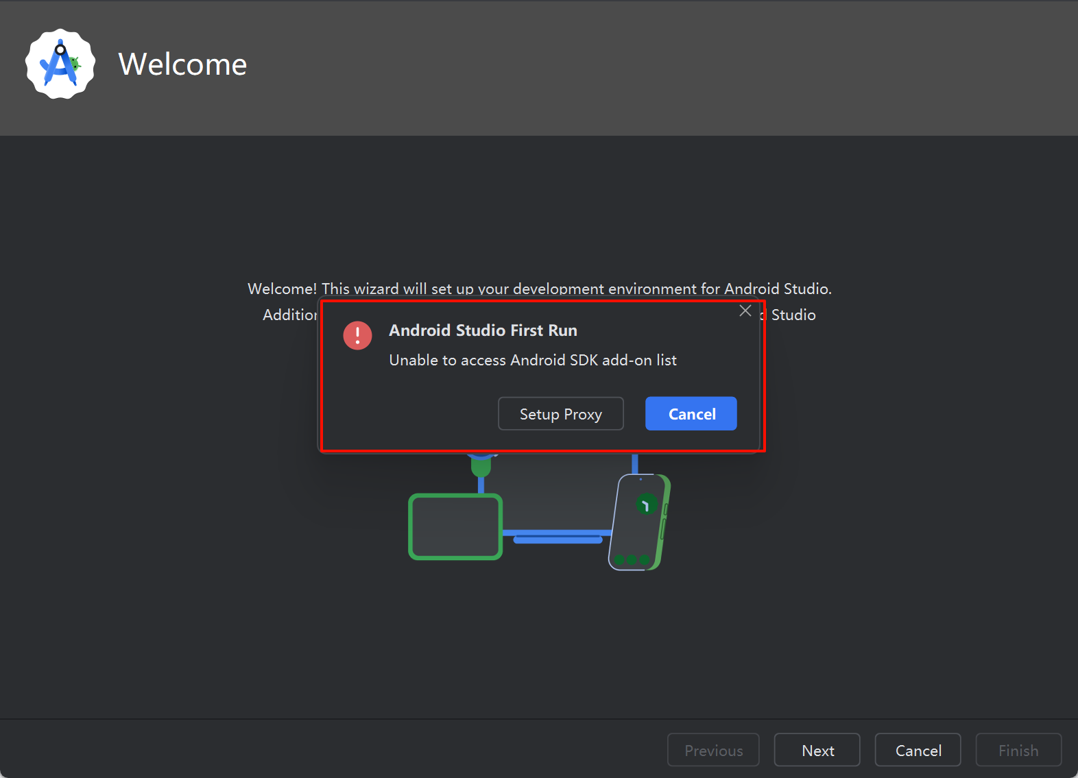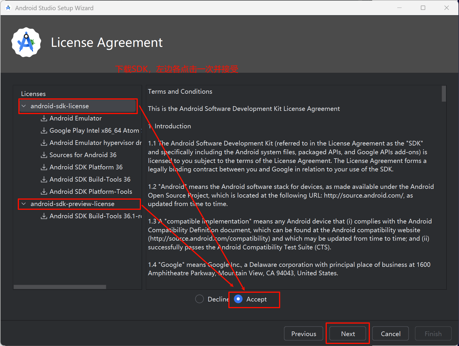 此处警告为未设置SDK,先不管,取消,然后点击next