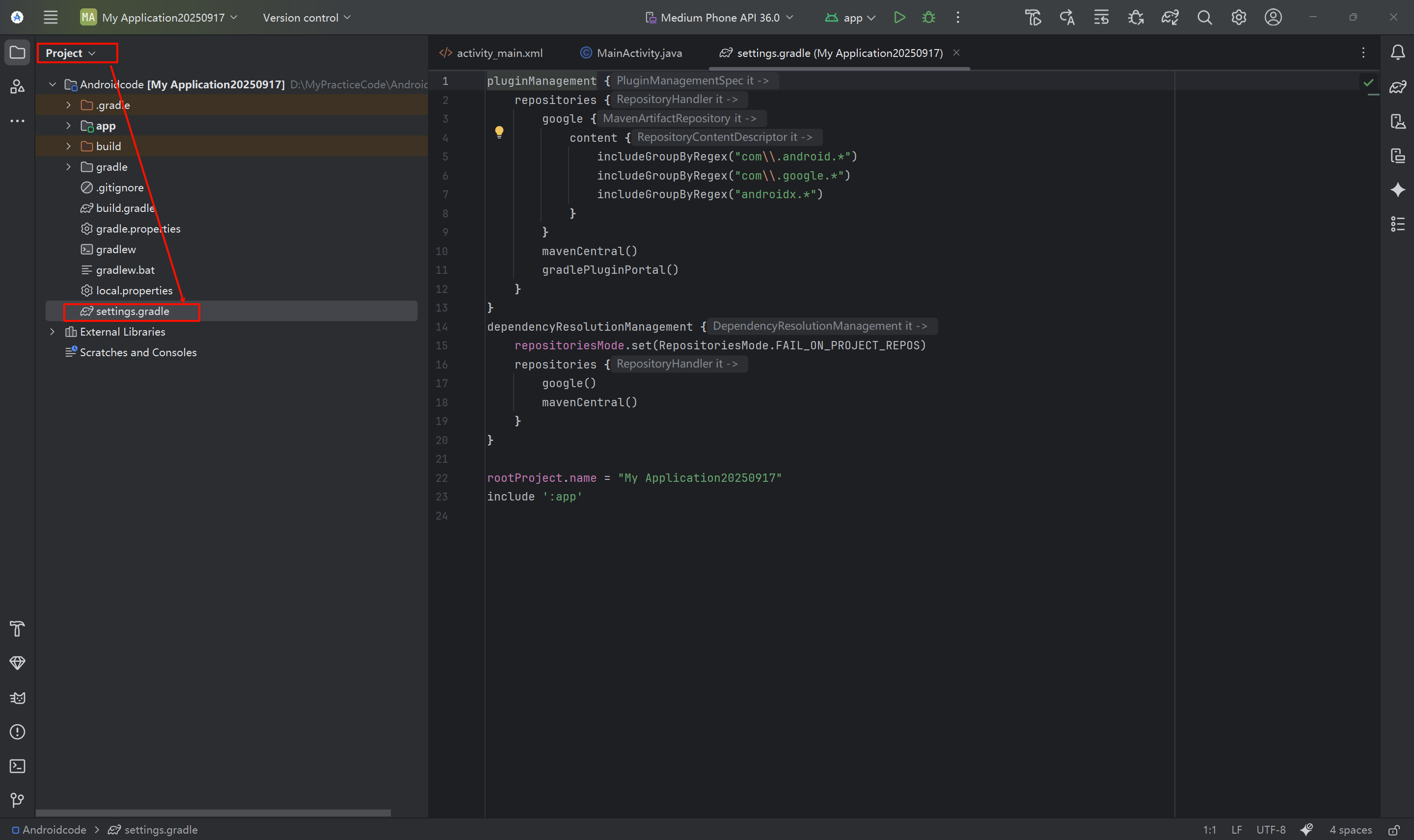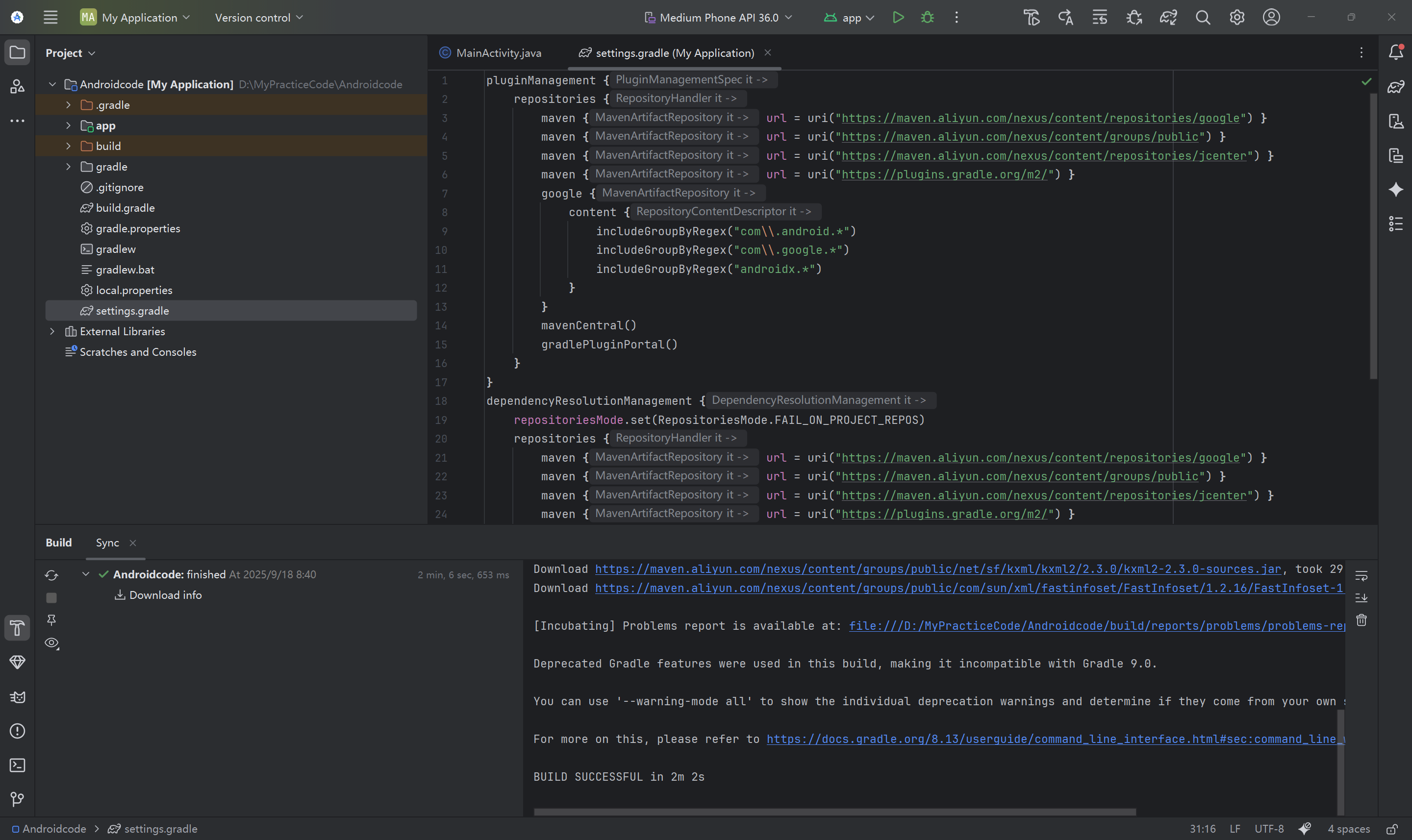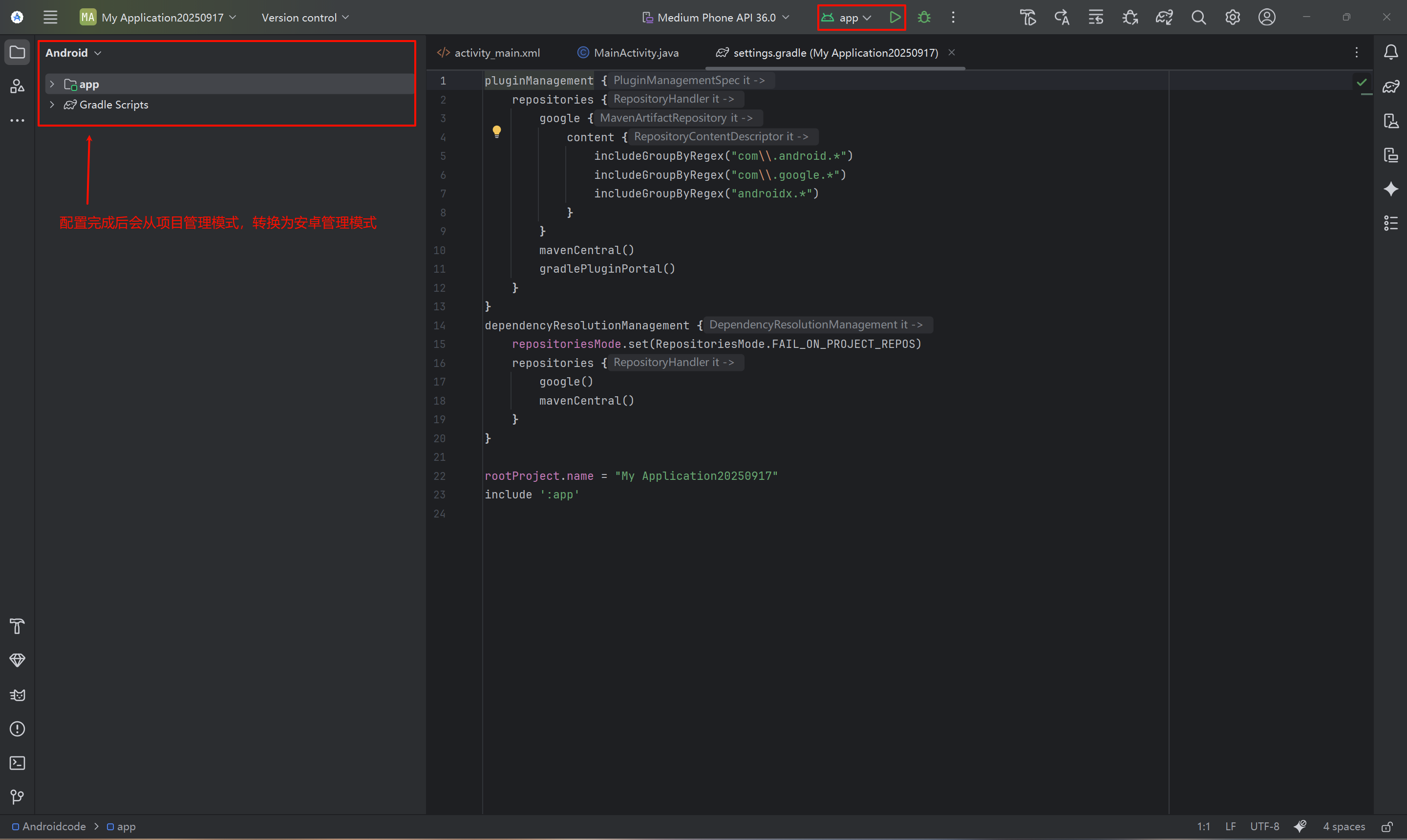 pluginManagement { repositories { maven { url = uri("https://maven.aliyun.com/nexus/content/repositories/google") } maven { url = uri("https://maven.aliyun.com/nexus/content/groups/public") } maven { url = uri("https://maven.aliyun.com/nexus/content/repositories/jcenter") } maven { url = uri("https://plugins.gradle.org/m2/") } google { content { includeGroupByRegex("com\\.android.*") includeGroupByRegex("com\\.google.*") includeGroupByRegex("androidx.*") } } mavenCentral() gradlePluginPortal() } } dependencyResolutionManagement { repositoriesMode.set(RepositoriesMode.FAIL_ON_PROJECT_REPOS) repositories { maven { url = uri("https://maven.aliyun.com/nexus/content/repositories/google") } maven { url = uri("https://maven.aliyun.com/nexus/content/groups/public") } maven { url = uri("https://maven.aliyun.com/nexus/content/repositories/jcenter") } maven { url = uri("https://plugins.gradle.org/m2/") } google() mavenCentral() } } rootProject.name = "My Application" include(":app")修改配置后重新更新一下gradle