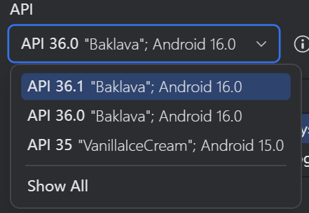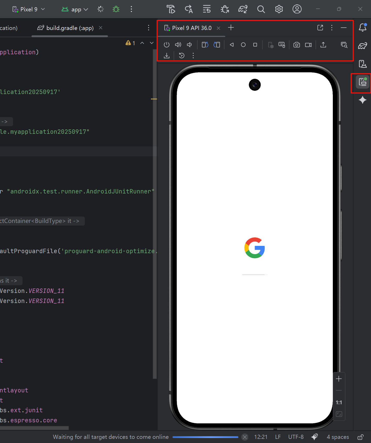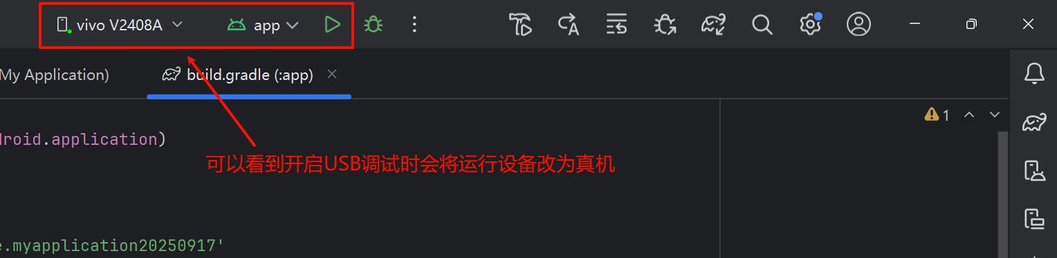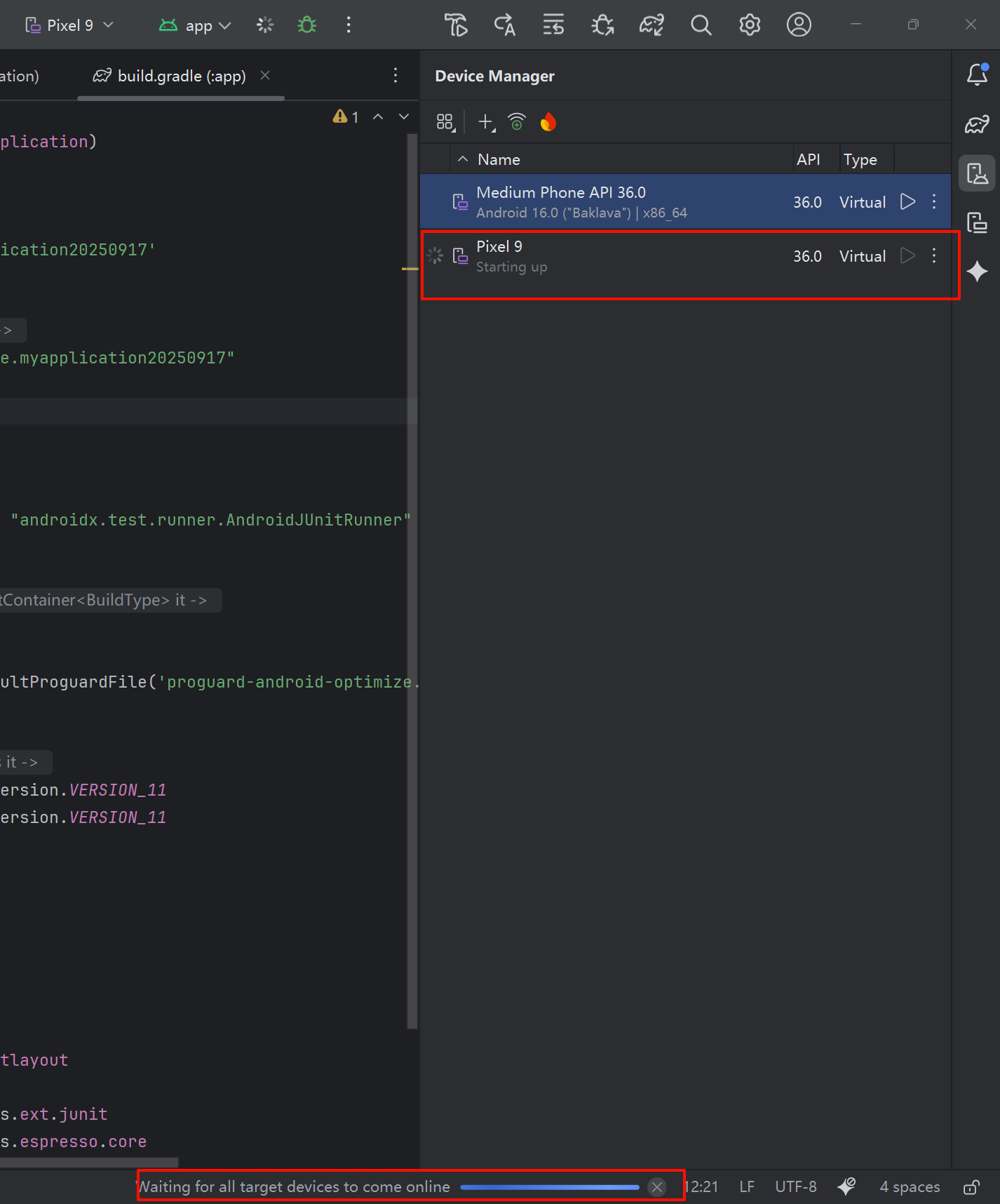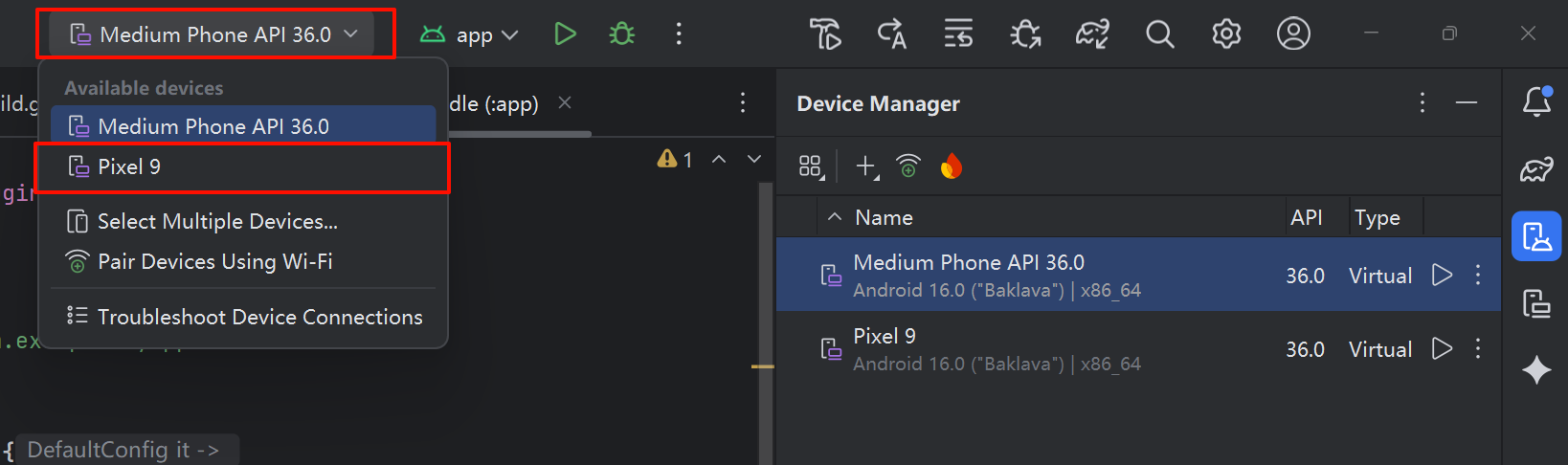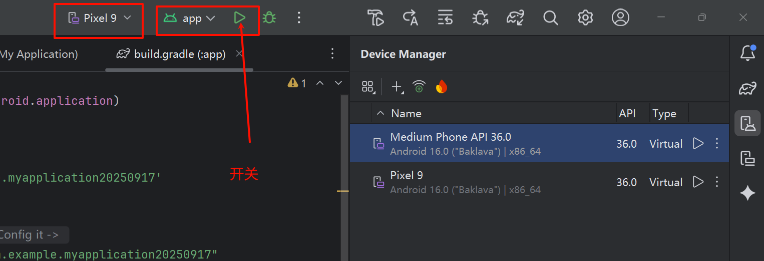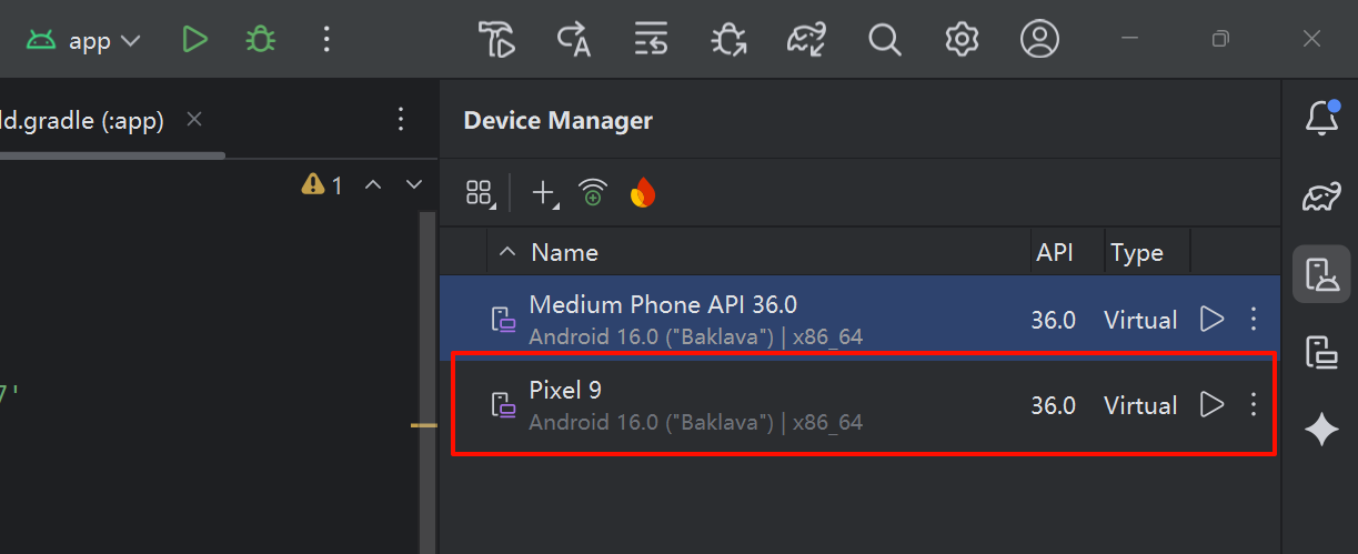 进入Android管理模式下的build.gradle文件可以看到本项目的最低与最高适配版本,选择虚拟机时要保证项目可以在其上运行