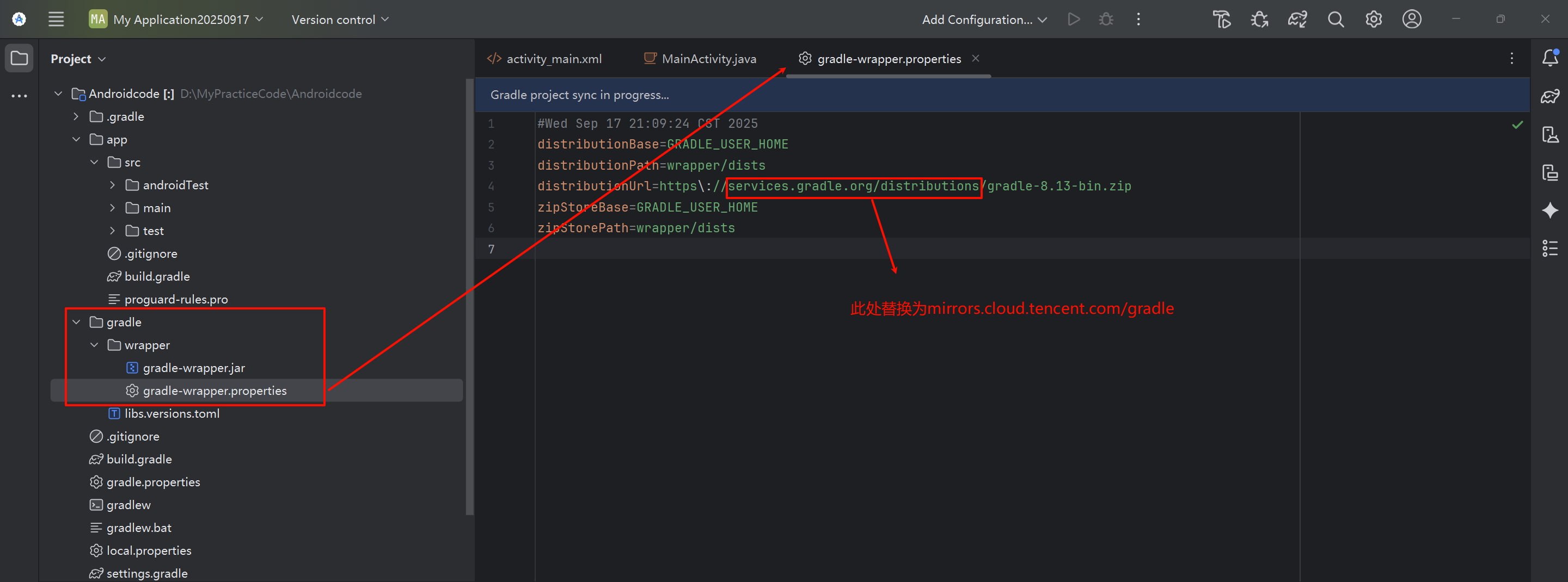 gradle-wrapper.properties,位置如下图所示:mirrors.cloud.tencent.com/gradle