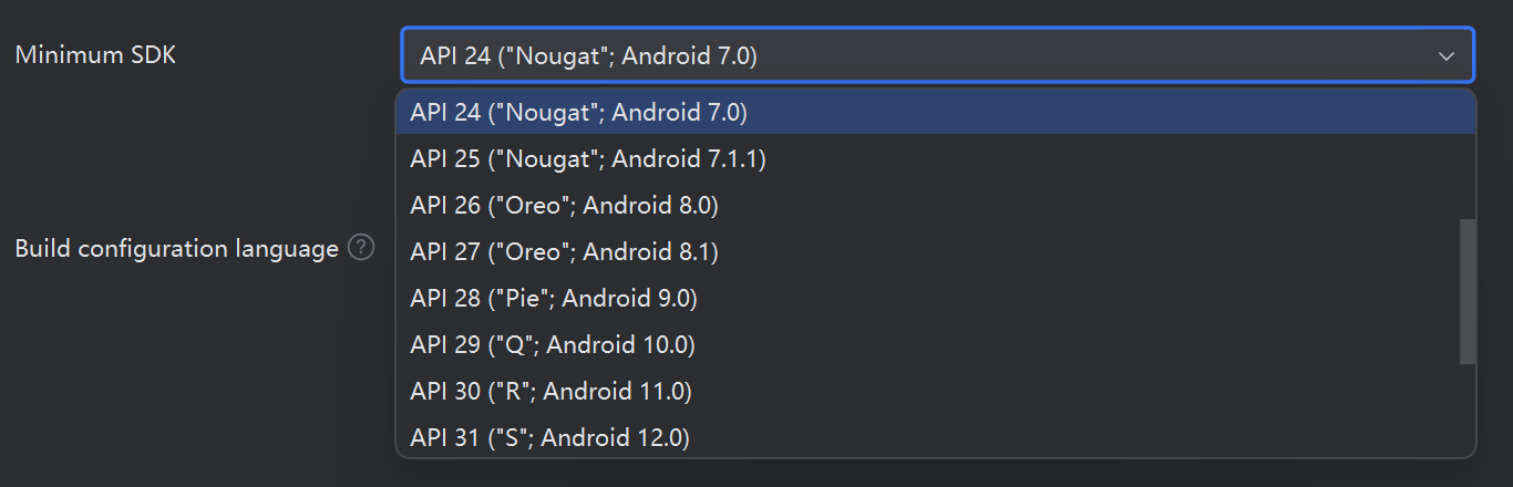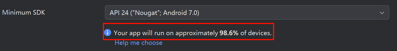 【Minimum SDK】选项为本项目适配的Android最低版本,选择API 24("Nougat";Android 7.0)即可,选择版本后会帮你预测适用范围