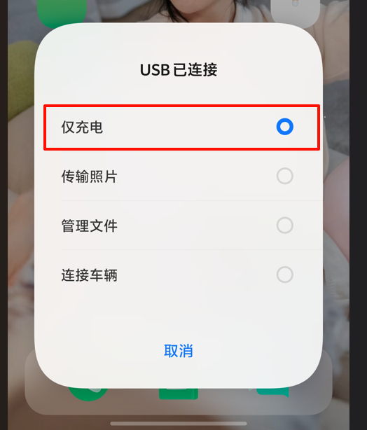 将手机与电脑用数据线相连,手机上选择 仅充电 模式