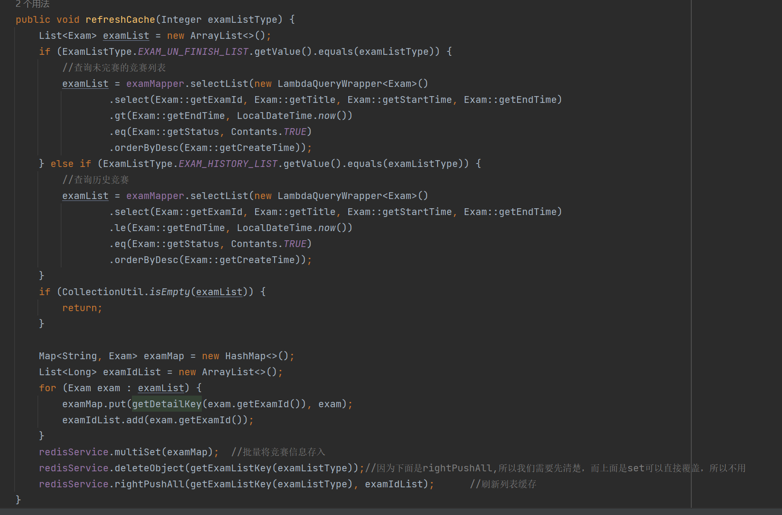 但是为了提高效率,我们的竞赛列表初始展示以及重置功能我们还是使用Redis缓存进行查询