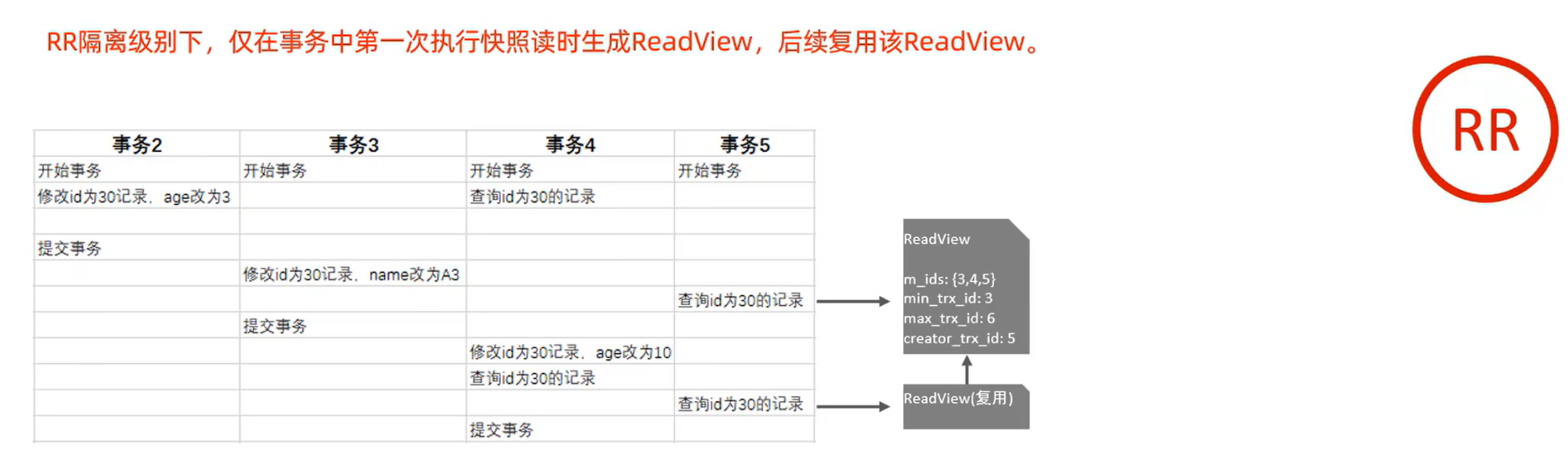 - 核心特性: 在同一个事务中,第一次执行快照读时会创建一个 Read View,之后在这个事务中的所有快照读都复用这个相同的 Read View。