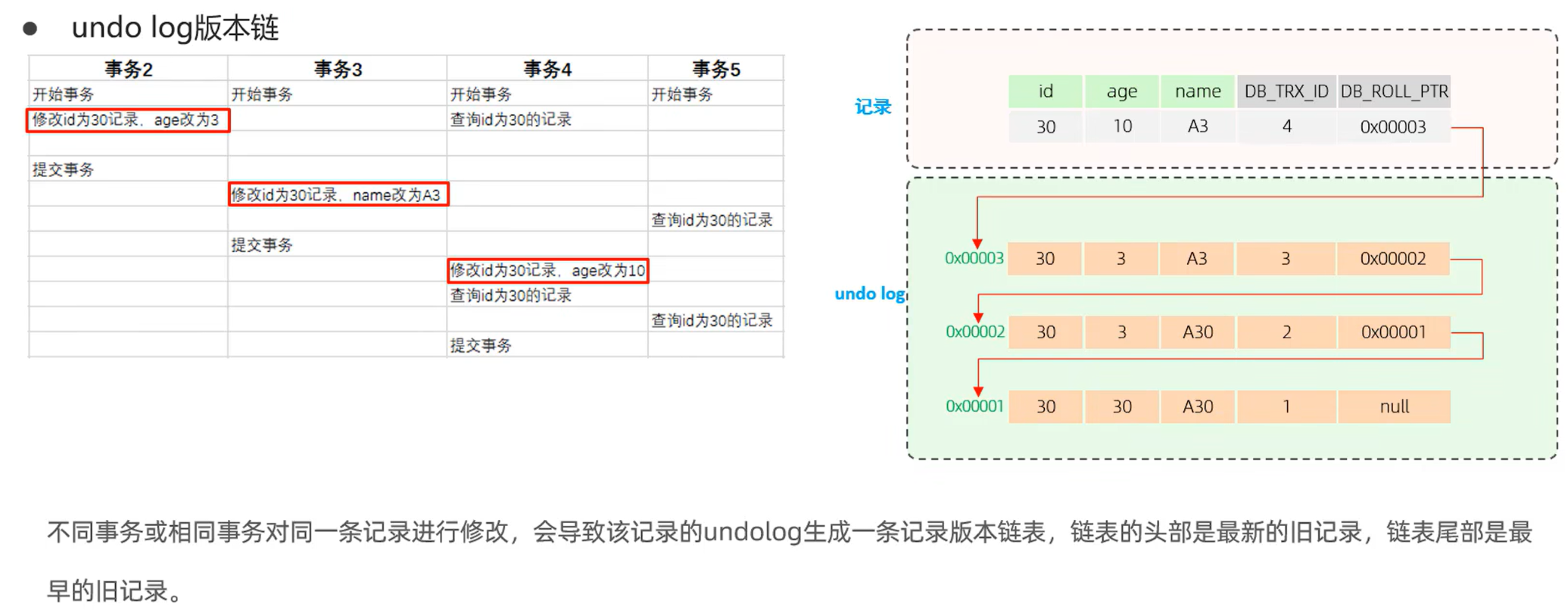 DB_TRX_ID和DB_ROLL_PTR。 - 修改操作会在 Undo Log 中创建历史版本,形成版本链。