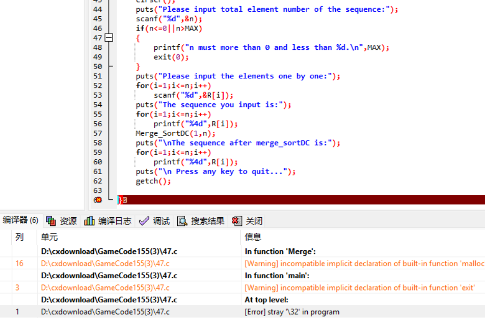 本次优化的对象是一段基于分治法实现的二路归并排序C语言代码,在编译运行及功能验证阶段,共发现4类核心问题,以下为错误分析及对应编译/运行截图说明:左图为原代码,右图为修正图。