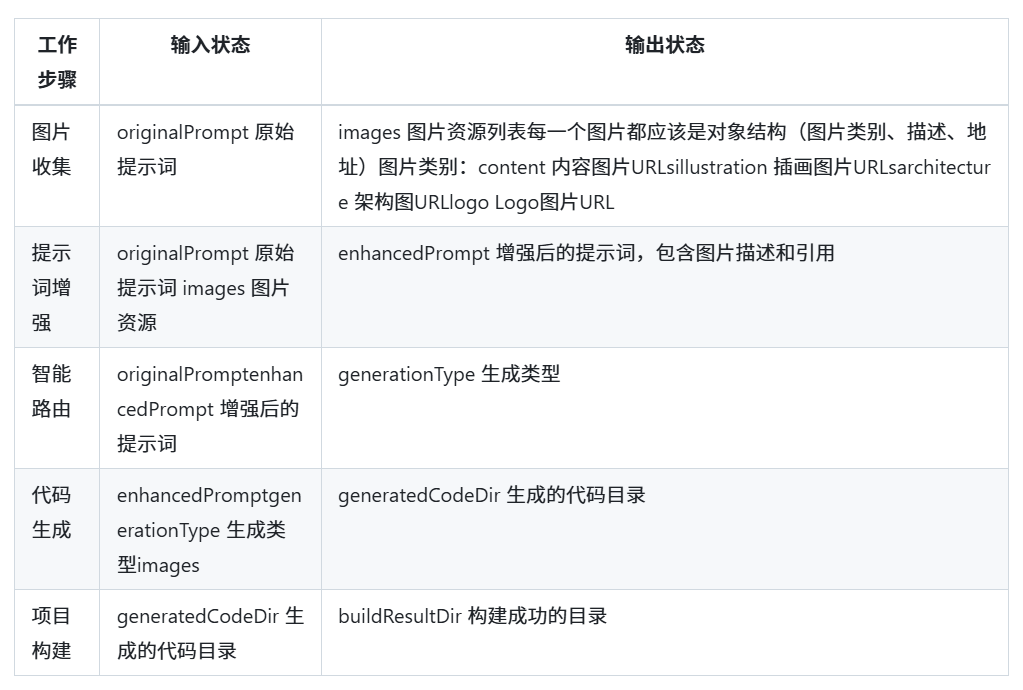 用户输入提示词 -> Agent通过工具调用从不同的渠道获取图片素材 -> 内容图片pexels网页搜索 -> 插画图片undraw抓取 -> 文本绘图+上传到COS -> AI生成或MCP服务Logo等设计图片 -> 提示词增强关联图片内容到原始提示词 -> 智能路由Agent选择模式生成网站(原生HTML、多文件、Vue工程) -> 利用搜索到的图片和根据上一步确认的模式生成网站 -> 文件保存项目构建打包