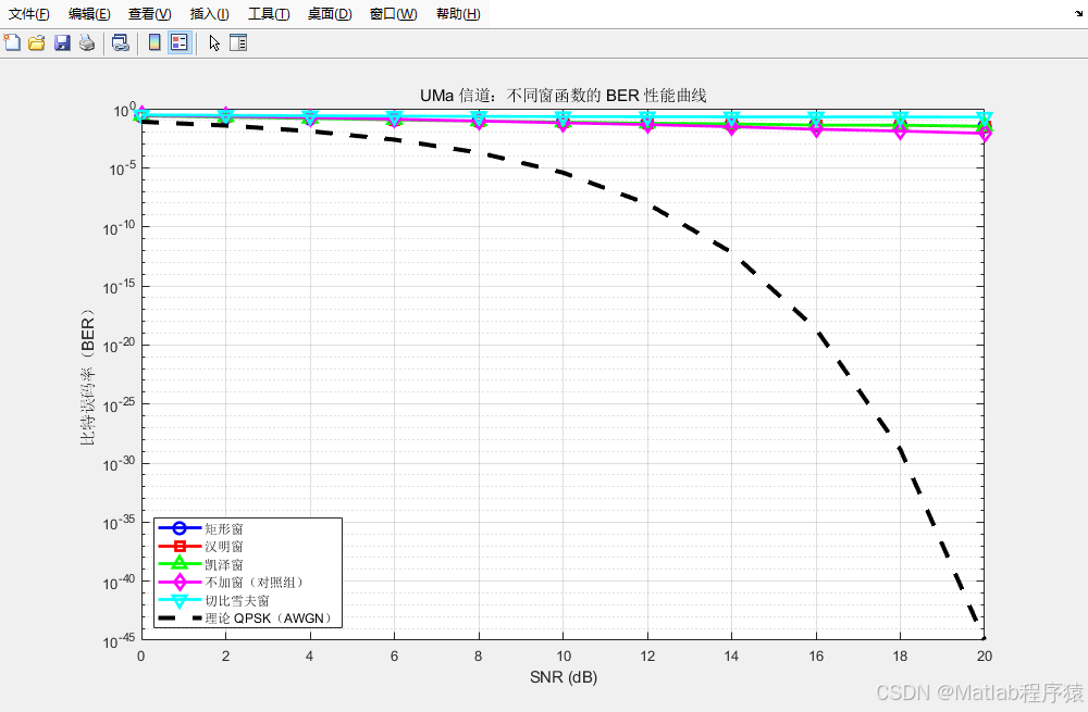 系统最终输出包括比特误码率曲线、均方误差曲线、横向条形图以及不同窗函数的性能改善指标等。通过这些图形化结果,可以看出改变时域窗函数对信道估计质量的影响,例如某些窗函数能显著降低估计噪声,使均衡后的误码率明显下降;而某些窗函数则可能因主瓣过宽导致估计结果过度平滑,使快速变化的信道细节无法完整恢复。不同窗函数的优势在于其对应的信道环境不同,因此系统通过多维度统计让这种差异清晰呈现。