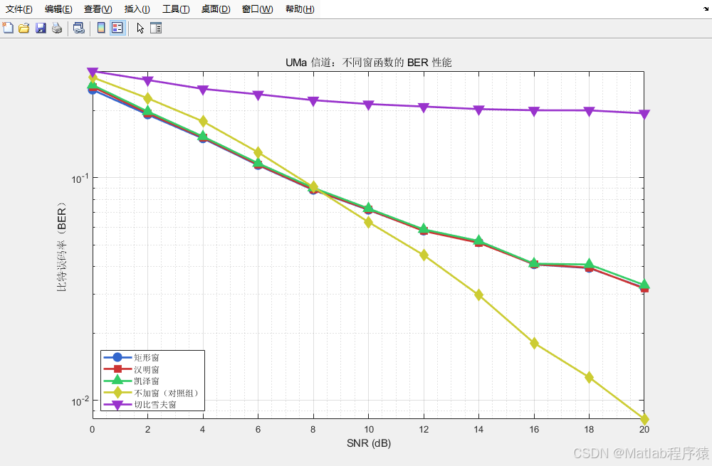 为了获得更全面的性能评估,系统使用 Monte Carlo 仿真方式,在多次随机信道和随机噪声条件下反复执行链路流程,统计平均误码率和平均均方误差。信噪比范围覆盖从低到高的多个关键点,使窗函数的性能曲线呈现清晰的增益趋势。通过对比窗函数与不加窗情况下的误差指标,可以得到更接近真实通信系统的统计性结论。
