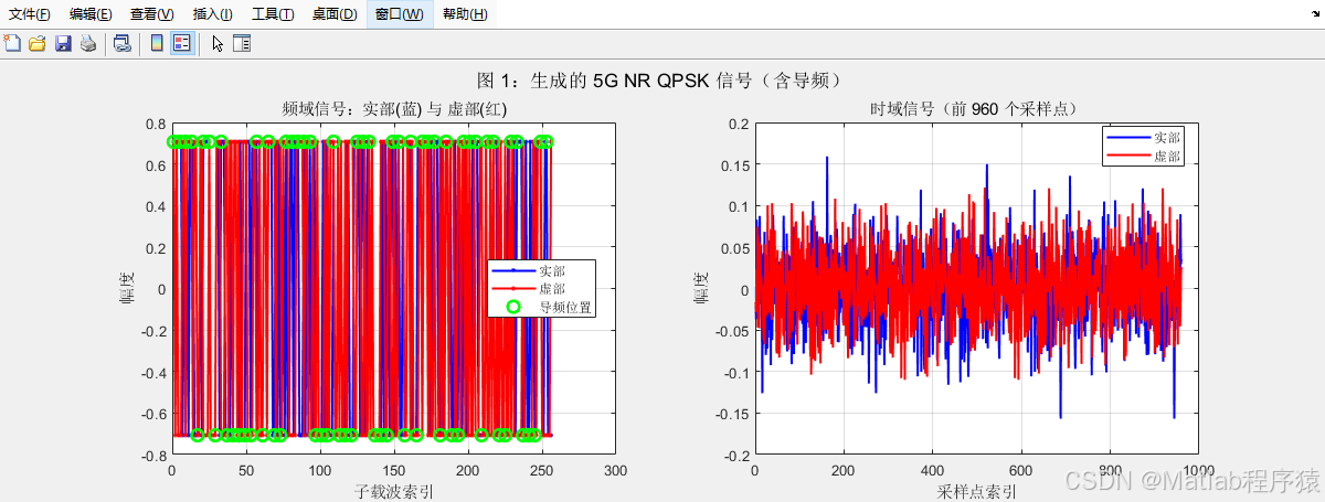 系统的起点为基带数据的生成和调制。在仿真环境中,数据采用 QPSK 方式映射到复数符号,这种调制形式在 NR 中具有结构简单、星座点间距均匀、实现复杂度较低的特点,因此常用于初步性能评估。调制后的符号被均匀地排布在 OFDM 资源网格中。OFDM 框架是 NR 波形的重要组成部分,它将宽带信道分解为多个窄带子载波,使每个子载波面对的信道条件更为平稳,从而降低多径时延引起的频率选择性效应。系统采用 NR 常用的子载波间隔和 FFT 大小,使整个仿真环境具备现实网络的参数特征。