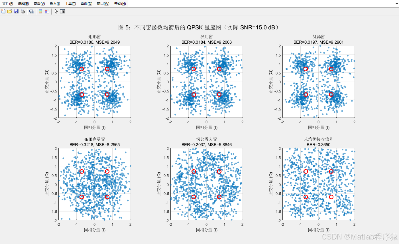 星座图用于直观观察均衡效果。通过不同窗函数对应的均衡星座分布,可以直观地观察噪声和衰落对符号的拉伸、旋转影响,并通过散点收敛程度判断信道补偿的有效性。不同窗函数对星座聚合度的影响差异明显,因此星座图成为系统分析的重要辅助手段。