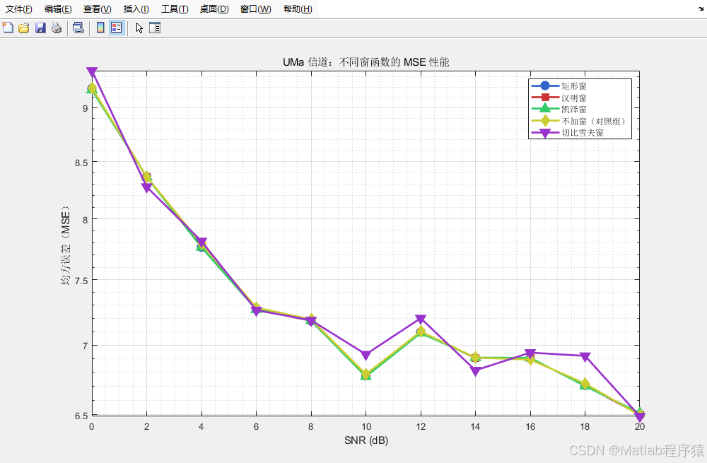 整套系统以全面、细致的方式重现了一个 5G NR 链路中从基带处理到接收端检测的完整流程,其特点在于重点突出信道估计中的窗函数处理方法,并对多种窗函数在不同噪声条件下的性能进行量化、可视化展示。通过系统的搭建,可以看出信道估计在 OFDM 系统中的关键意义,也能够体会到窗函数在改善频域响应平滑度、降低噪声影响方面的重要性。从工程实现角度看,这些结论可为实际 NR 接收机算法的设计提供参考,使其更有效地处理时变、多径严重的无线环境。