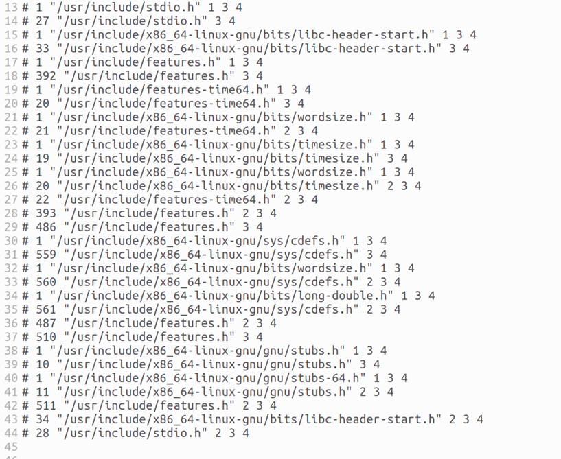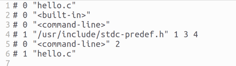 预处理后的hello.i为可读的文本文件,可使用gedit查看hello.i的内容。观察发现,hello.i共3902行,原本hello.c中的注释全部消失,前几行为有关源程序的一些信息: