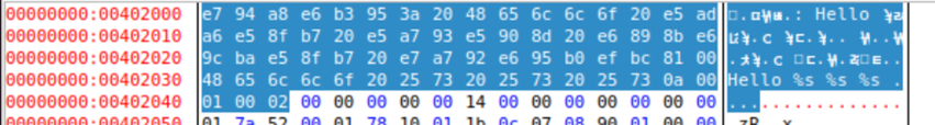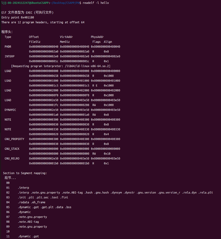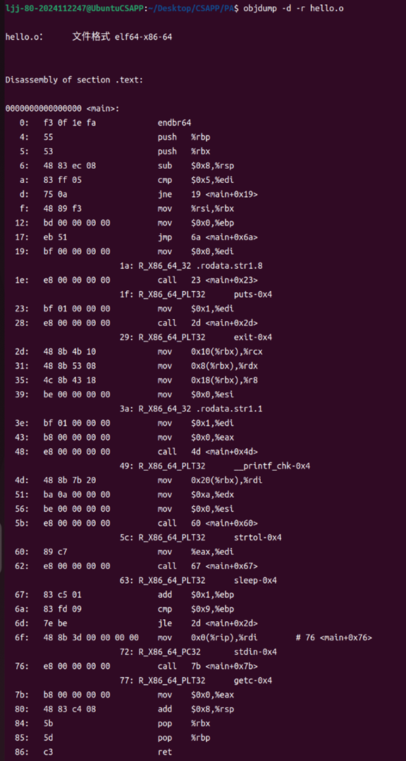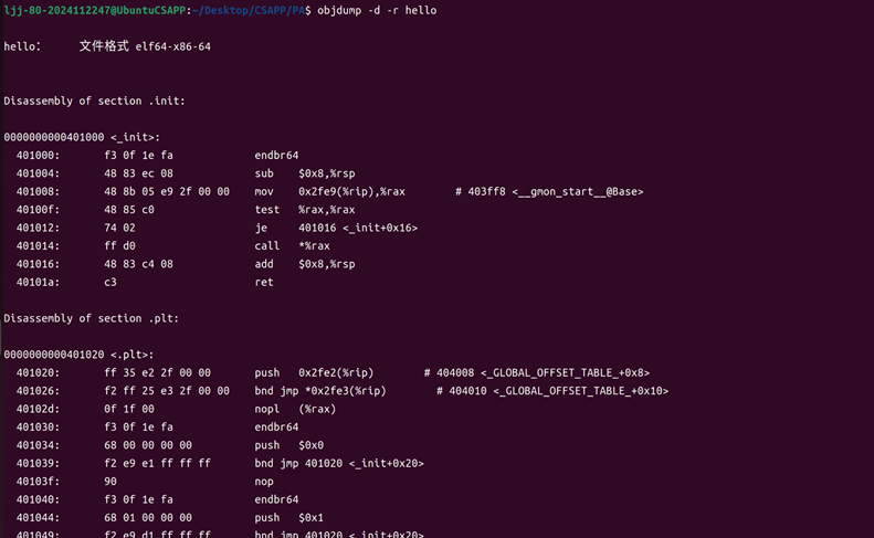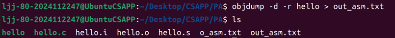 out_asm.txt:hello可执行文件的反汇编文本输出。展示链接后具有实际虚拟地址的指令序列,便于与 o_asm.txt 对比,观察重定位与地址绑定的具体结果。