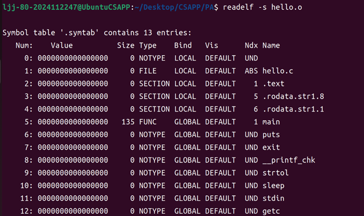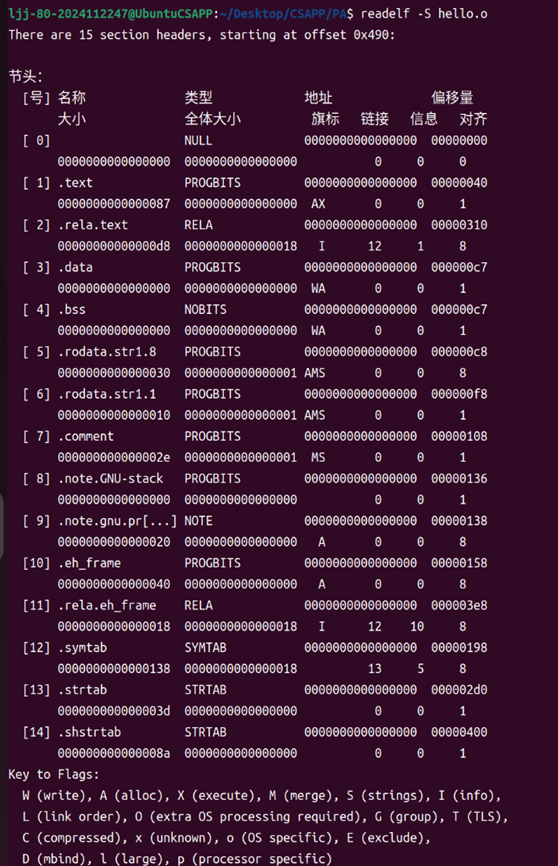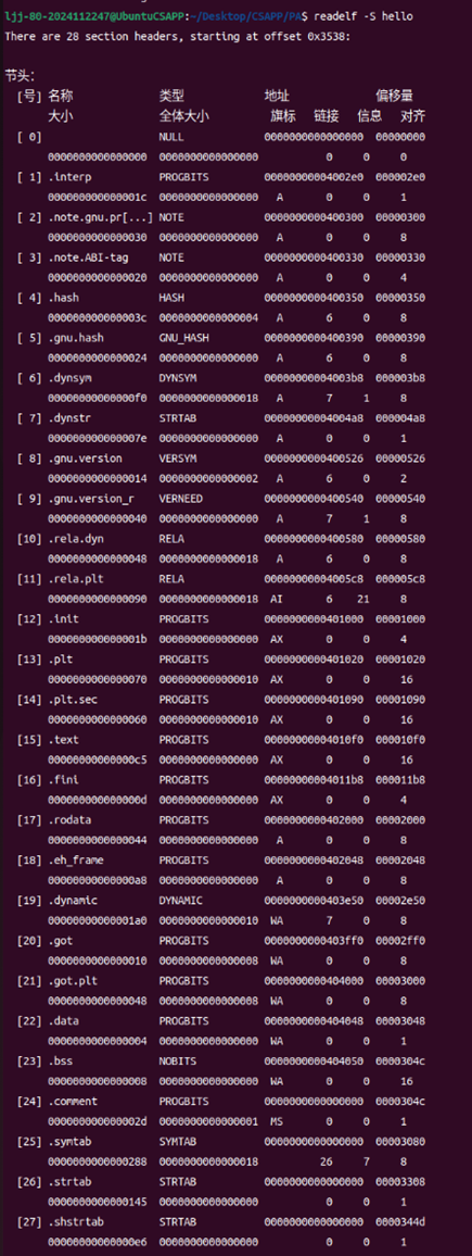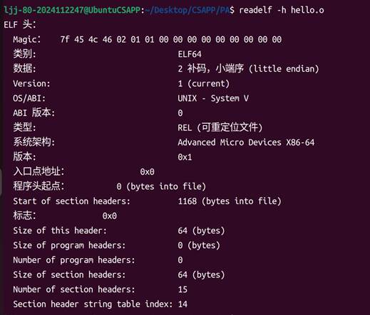 hello.o:hello.s汇编后的可重定位目标文件。可用 objdump、readelf 等工具分析其ELF结构。