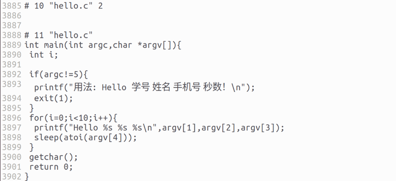 最后为hello.c的源代码,如下图,除注释与以“#”开始的语句被删除,其余部分与源代码保持一致