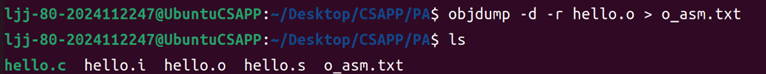 o_asm.txt:hello.o的反汇编文本输出。展示目标文件的机器指令与汇编助记符对照,用于分析未链接时的代码布局与重定位需求。