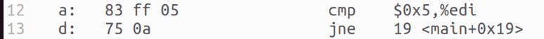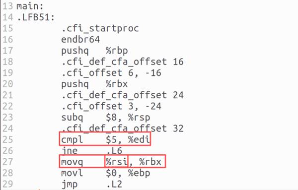 cmpl比较$5与%edi,jne为如果判断两者不等,则跳转.L6错误处理,否则继续执行