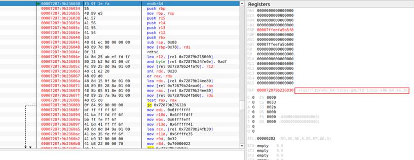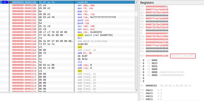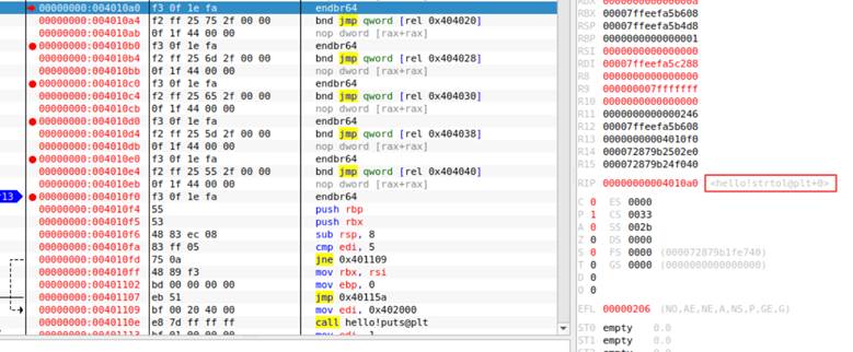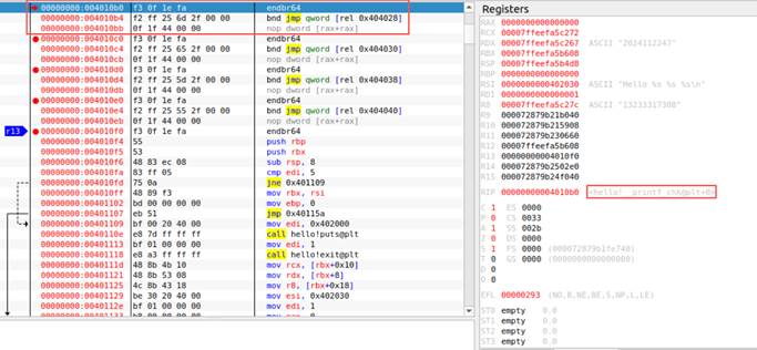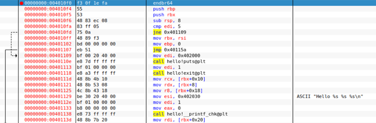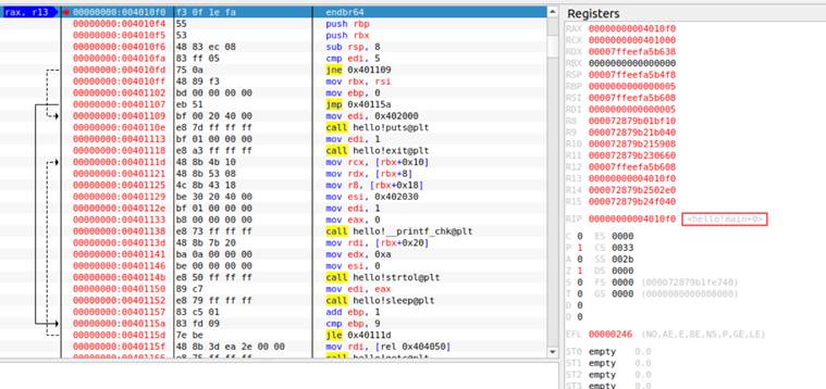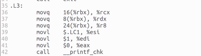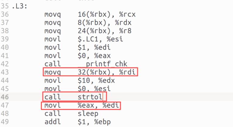 从上图可以看出,寄存器先保存argv基地址到%rbx,然后通过偏移计算访问数组中别的元素(+8为地址+8字节,64位操作系统中即为数组下一元素)