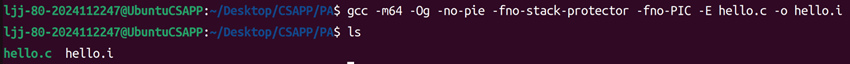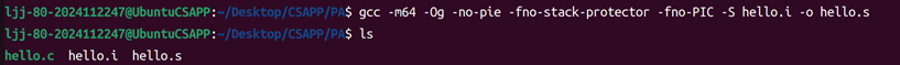 还可使用cc1命令预处理:/usr/lib/gcc/x86_64-linux-gnu/11/cc1 hello.i -o hello.s
