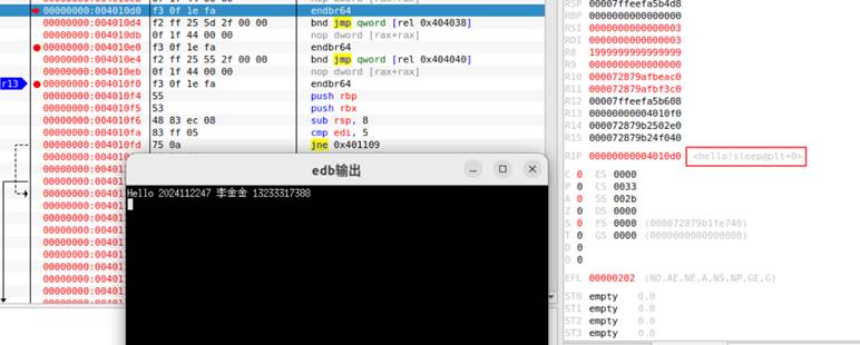 hello.c中的atoi(argv[4])为类型转换,具体实现如下图,第一个红框是将argv[4]存入寄存器%rdi,作为参数传入函数strtol,将原字符串类型转换为long,并存入%rax作为返回值,完成显式类型转换(字符串→long)。调用sleep时,将%eax的值(%rax的低32位)存入%edi作为参数,实现了隐式的类型转换(long→int)。最终实现了字符串→int的类型转换