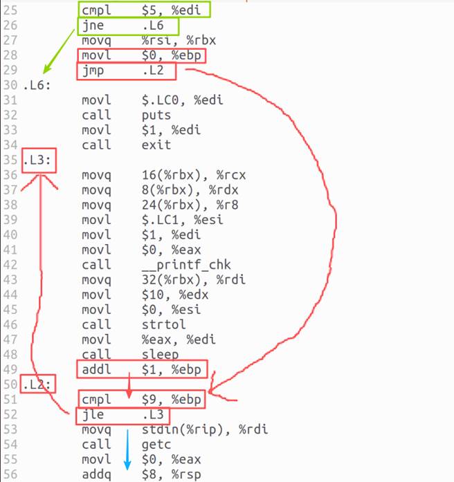 如下图所示,绿色标注为if判定,判断若$5与%edi(argc)不等,则跳转.L6错误处理,否则继续执行