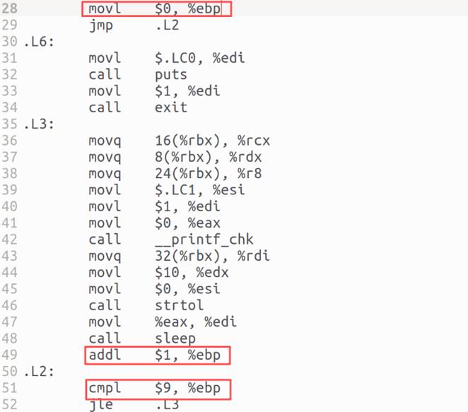 见图9第一个红框,使用movl指令将立即数$0存入寄存器%ebp,完成了对局部变量i赋初值0