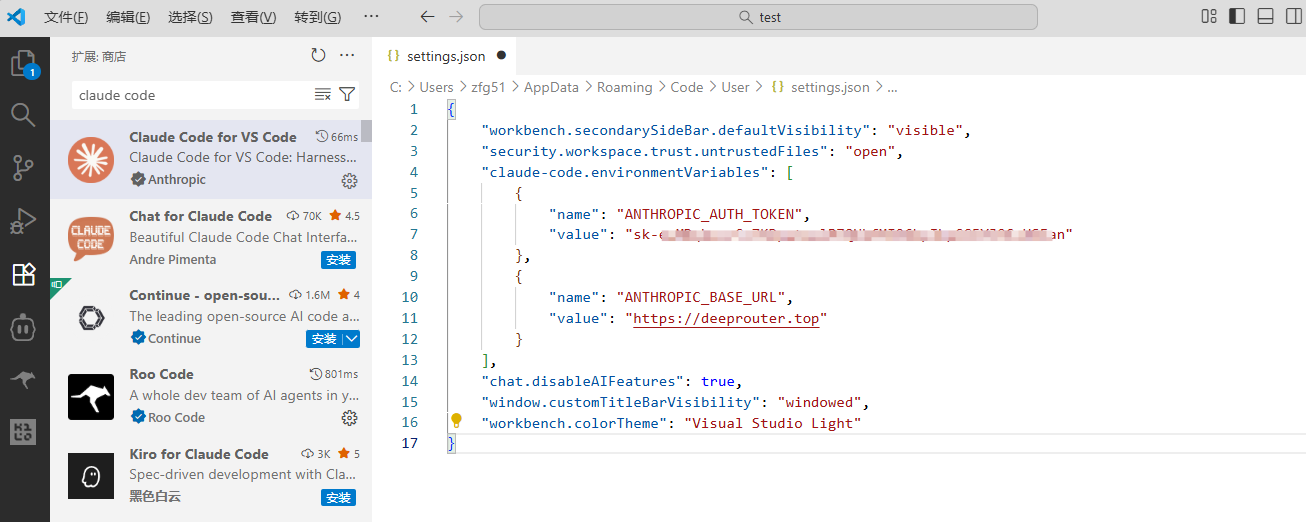 回到 VS Code 扩展商店中,打开 Claude Code 插件设置,然后跳转到 JSON 配置文件的编辑页面