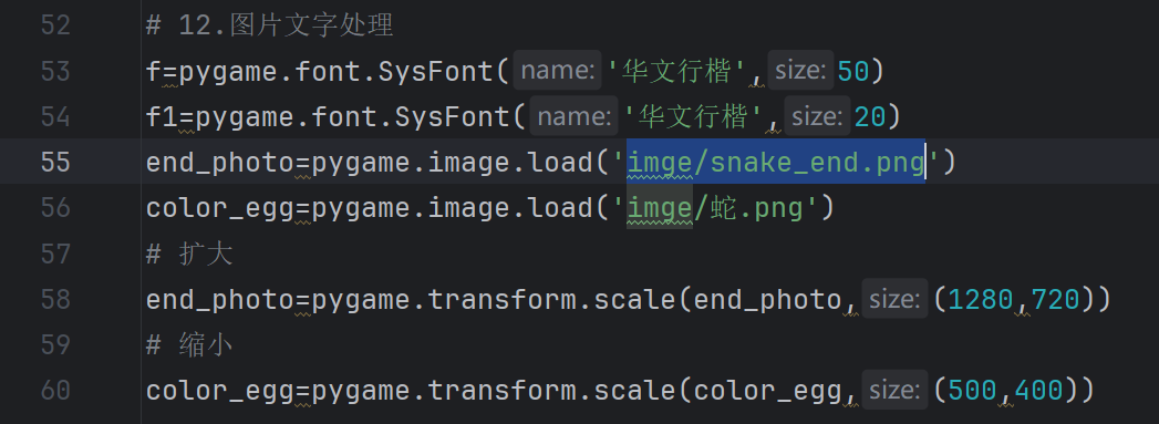 # 扩大 end_photo=pygame.transform.scale(end_photo,(1280,720)) # 缩小 color_egg=pygame.transform.scale(color_egg,(500,400))