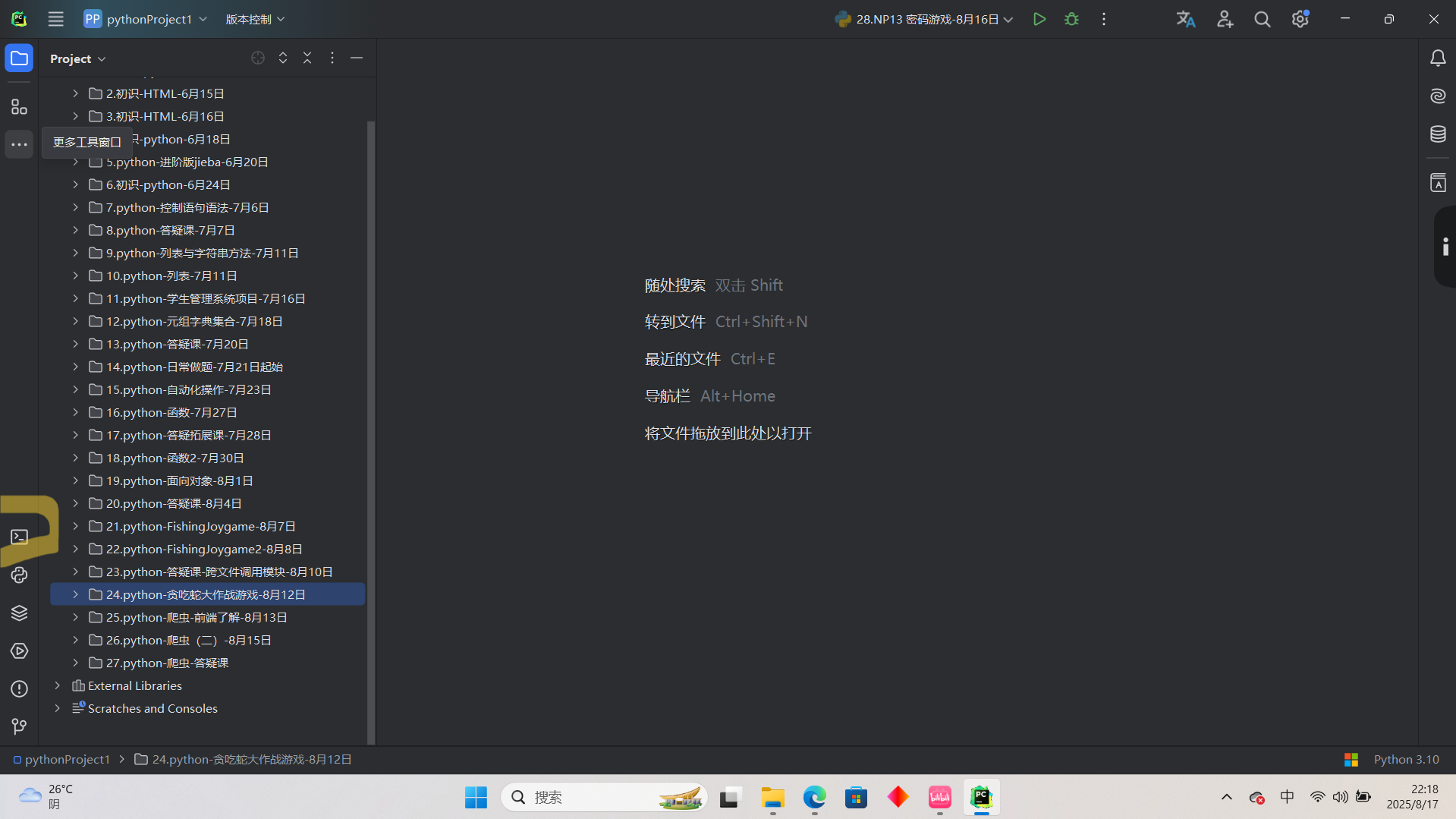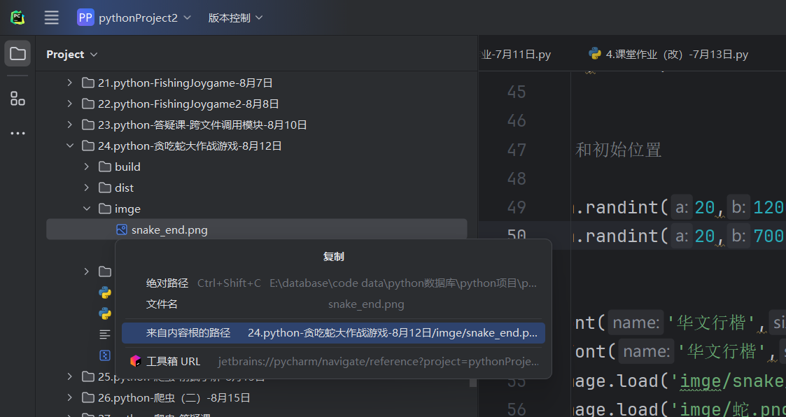 “E:\\database\\code data\\python数据库\\python项目\\pythonProject1\\24.python-贪吃蛇大作战游戏-8月12日\\imge\\蛇.png ”,当然我建议文件地址复制过来之后像我一样多加一条斜杠,这是为了防止转义字符影响文件地址的使用,当然你也可以使用正斜杠“/”,这样就不会被影响了。