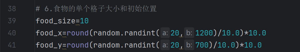 random.randint(20,1200),取20-1200的随机数,为什么要除以10.0呢?因为蛇饲料的大小是10为单位,除以10.0,用round()取整在乘以10,就可以防止出现除了10的倍数之外的值。
